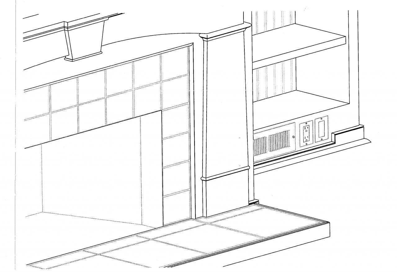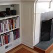 First to go were the bookcases, to be replaced by adjustable height units with hidden lighting and power outlets. By using bead board as the panel material (see picture 3) we were able to tie it together with the bead board wainscoting in the room.