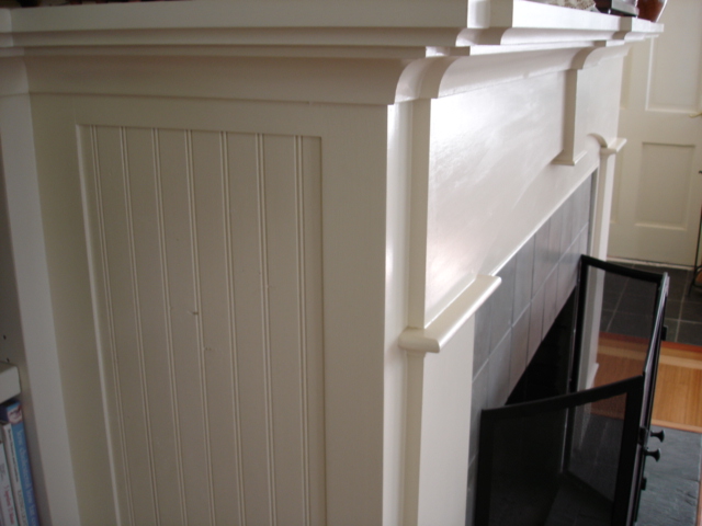 The trim detail on the mantel gives the illusion of depth without intruding into the living space. A tile surround was added around the fire box in a color which complements the slate. Tying the entire project together is the mantel which wraps around the fireplace into the top of the bookcases, making it just over eleven feet long!