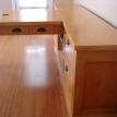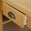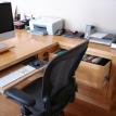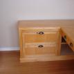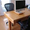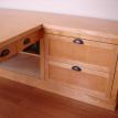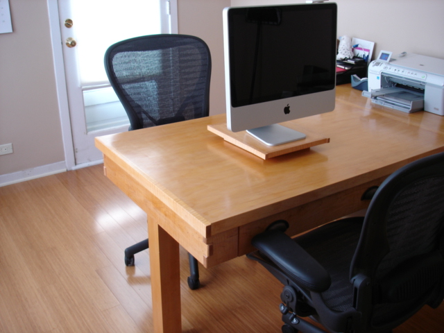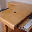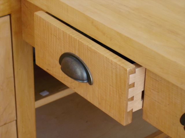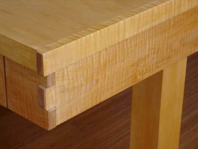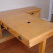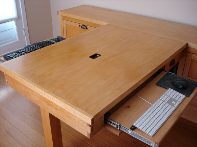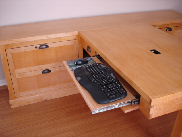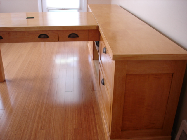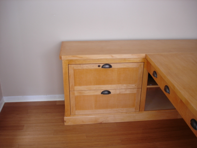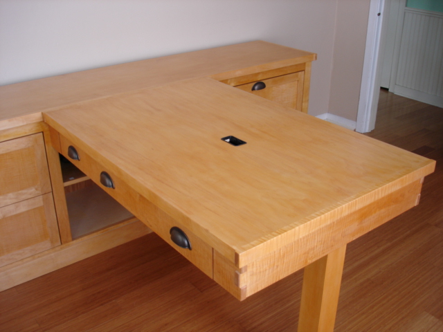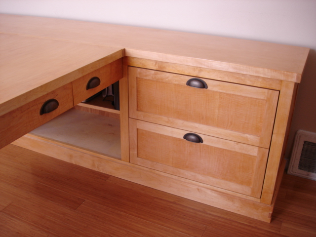 This desk is made from cabinet grade maple plywood, solid stock maple and tiger maple and tiger maple veneer. The finish is a custom blended shellac with a paste wax polish. The ends of the cabinet and file drawer fronts are panel and frame construction where the frame is solid stock maple and the panels are tiger maple veneer. The drawer fronts and end of the desk section are made from a continuous piece of solid tiger maple. The computer sits on a maple "Lazy Susan" with tiger maple edging.