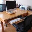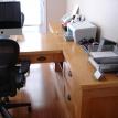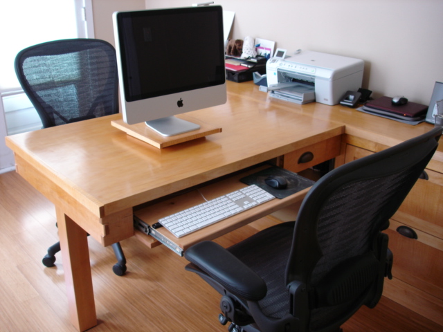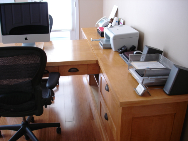 This desk went through many revisions before the the one you see here came about. It started as a standard face-to-face partners' desk, but that doesn't allow for much file storage. Then we looked at side-by-side, but that doesn't lend itself to sharing a computer - and where do you put the printer and fax? Since the standard "L" shaped secretary's desk offers lots of storage and good functionality .... why not do a back to back "L" or in this case a "T"? By having the computer on a swivel, it is a simple matter to turn it to either side and with the printer/scanner at the top of the T, it is easily accessible without even having to move from your chair. Both sides have two file drawers, each can hold two rows of files front-to-back (letter size) or one row side-to-side (legal size). Since one never knows what the future will hold, the desk portion can also be removed and doors added in the center making for a large wall credenza.