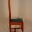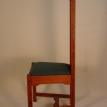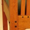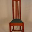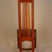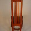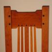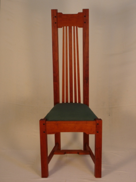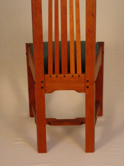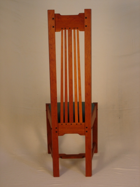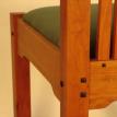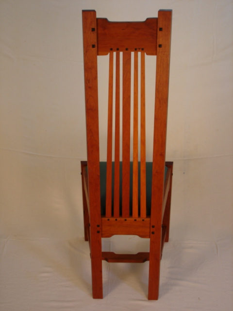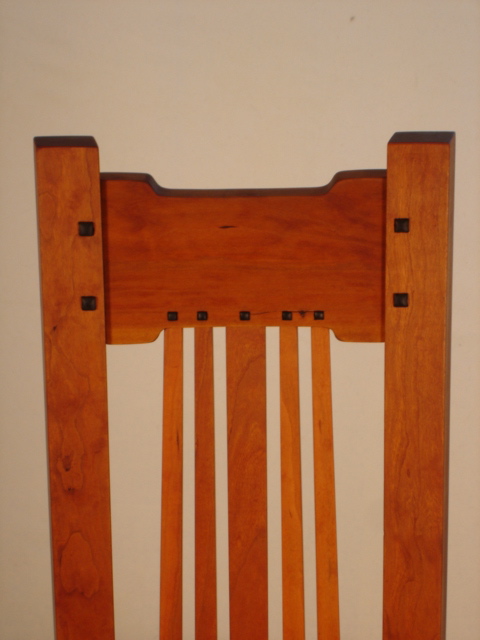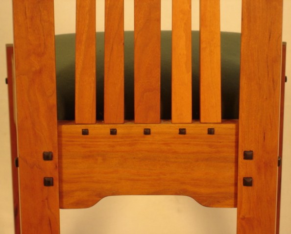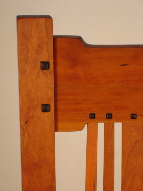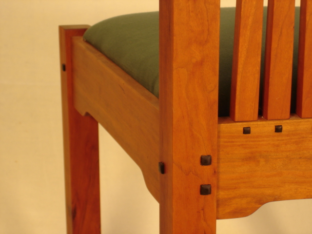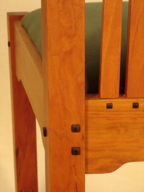Like a lot of Arts and Crafts furniture, it appears relative simple until you look at it closely. This chair has very few right angles. The seat is a trapezoid and the legs are parallelograms (11degrees off square) the seat is also raked at 7 degrees. There are 30 "pillowed" pegs (10 are 1/4" and 20 are 3/8")This all makes for very complex construction. This chair is constructed in cherry, the pegs are ebony.